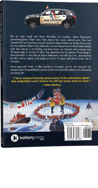 On an epic road trip from Mumbai to London, Badri Baldawa’s granddaughter Nishi asks him about his many adventures. She had joined him on his drive around Iceland where their car broke down and she wondered what other adventures her Nana must’ve had. When Badri tells her about a terrifying incident from his Kailash-Mansarovar trip 30 years ago, it only whets her appetite for his stories. There begins the narration—the life of Badri Baldawa—as told by him, punctuated by the many sights and stops on their 72-day self-drive road trip from Mumbai to London.